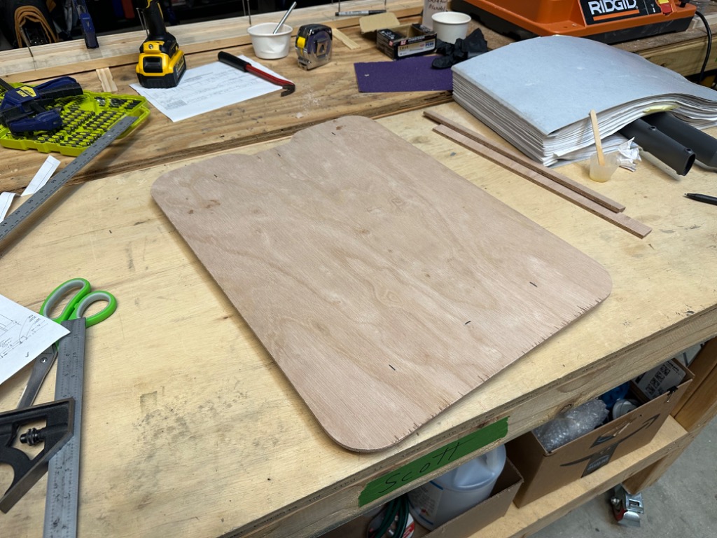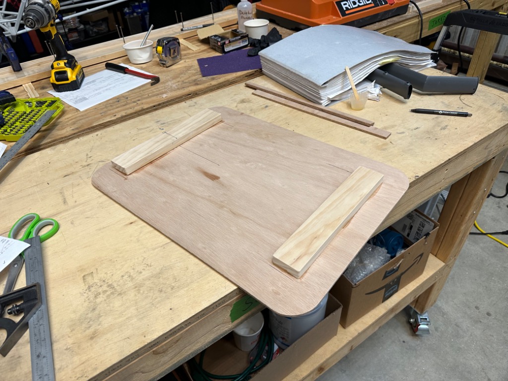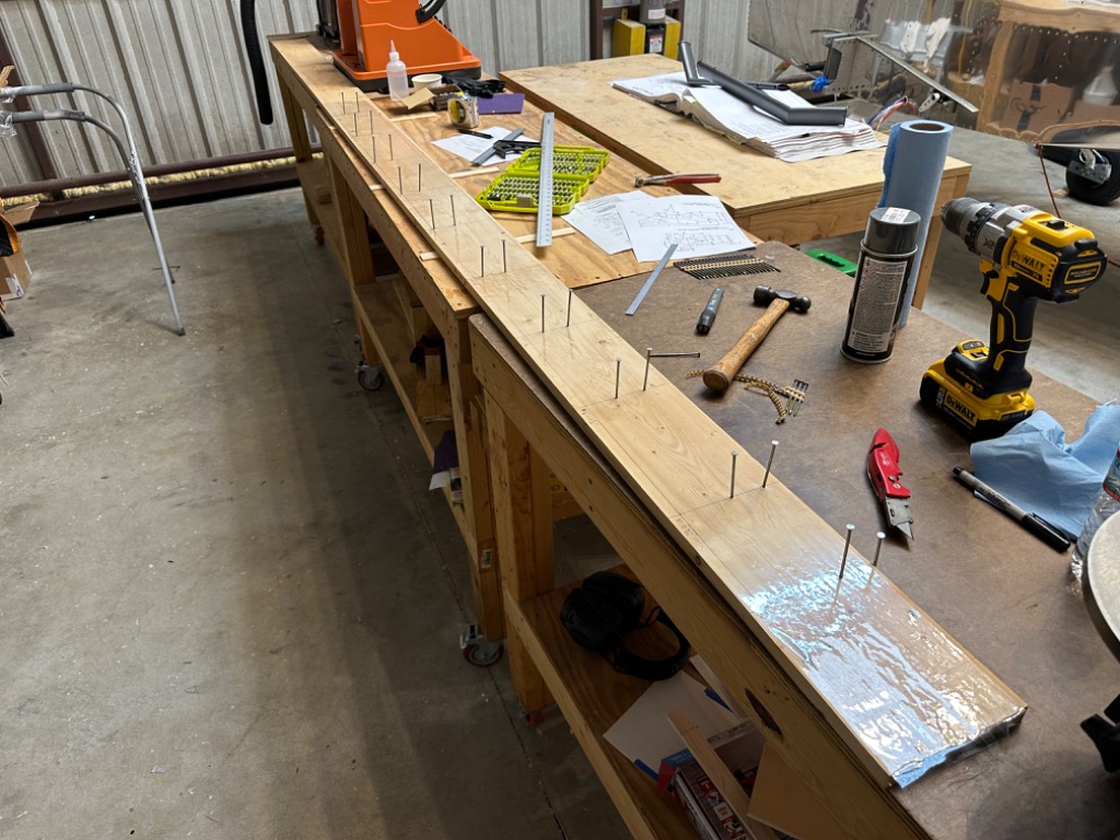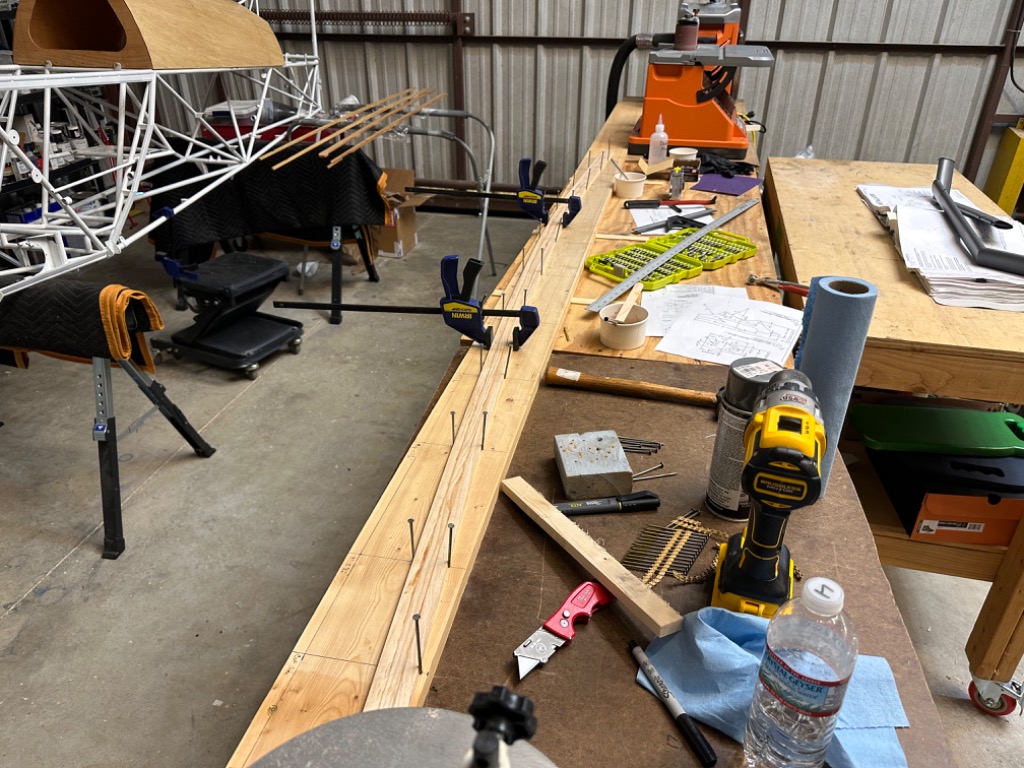 Fabricated fixture for laminating bottom stringers. Laminated bottom stringers. Fabricated seat back