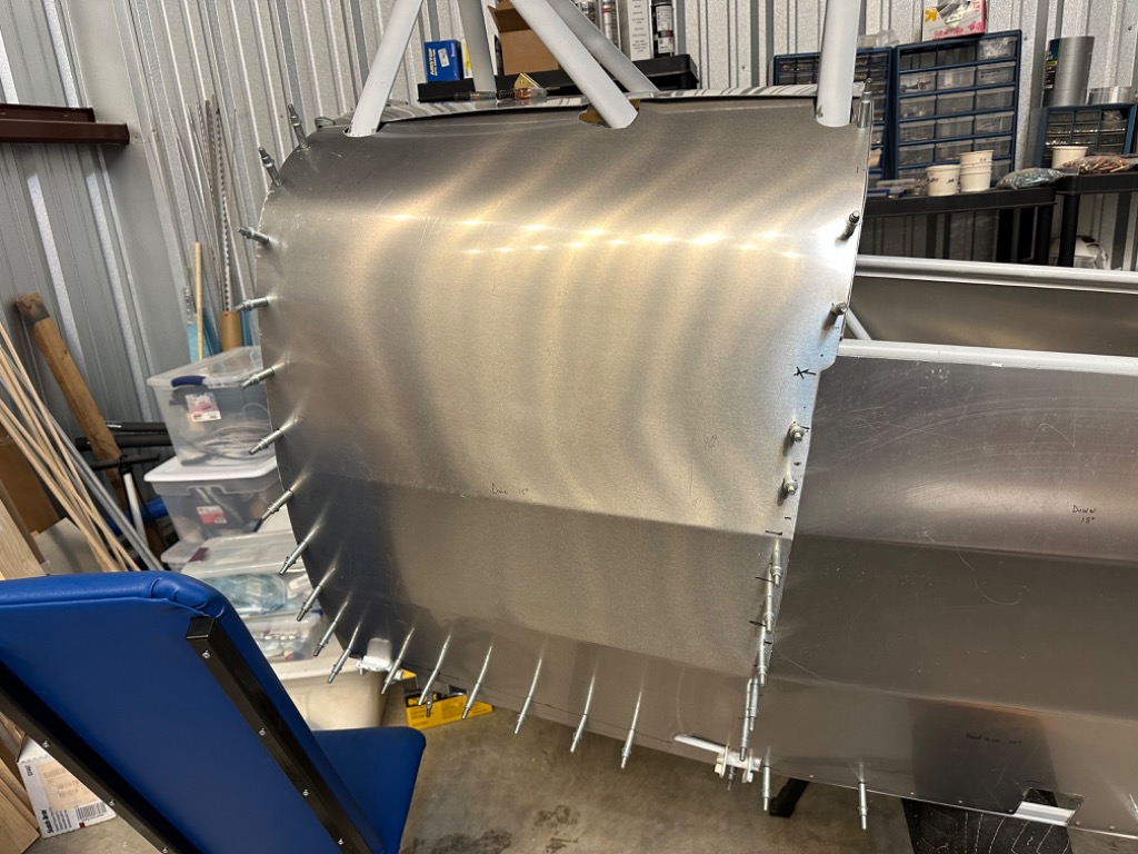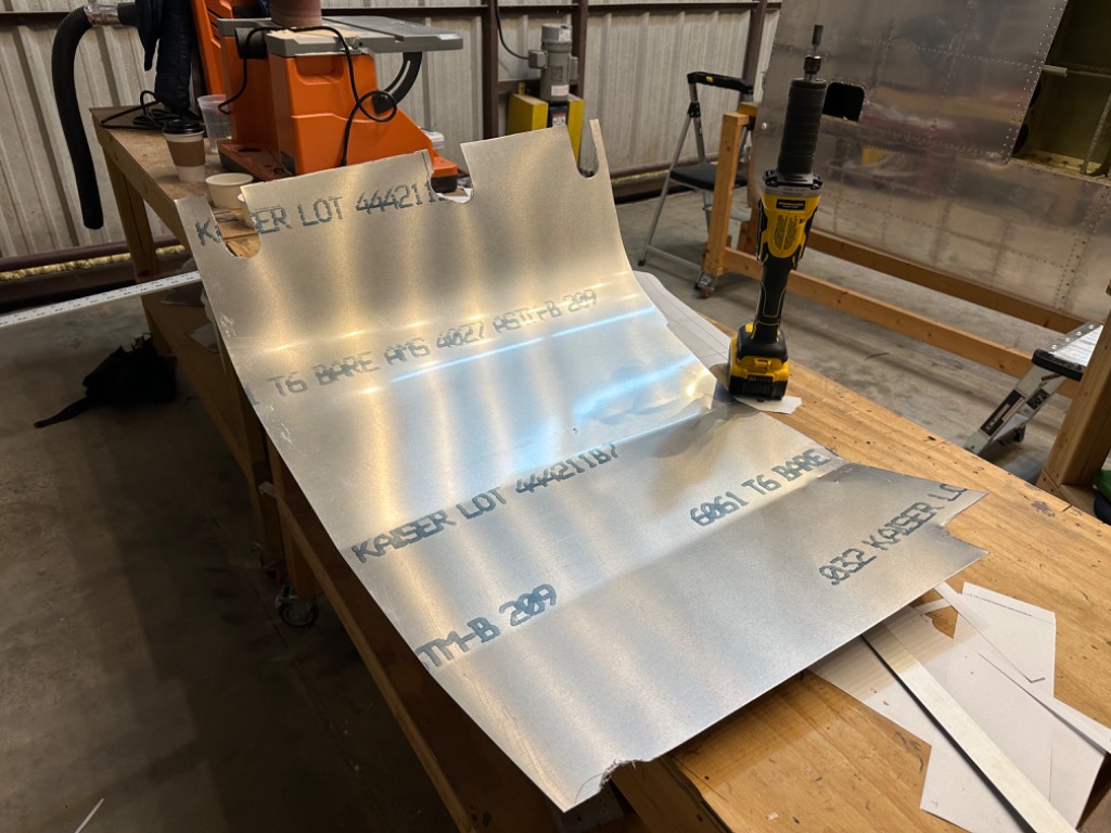 Drilled left forward skin to fuselage. Began fabricating forward right skin